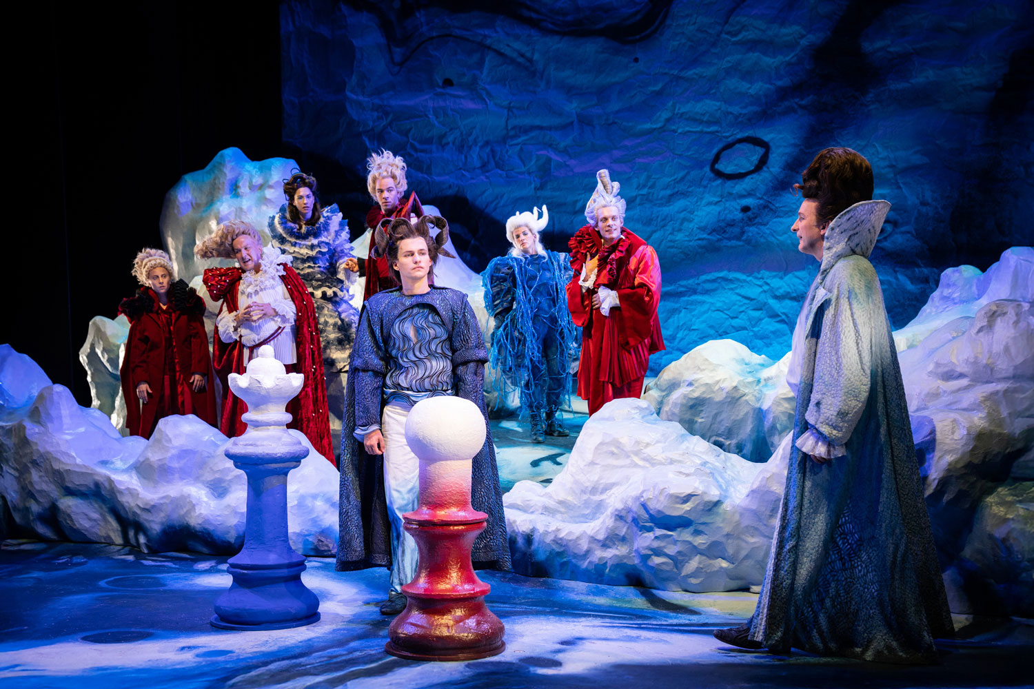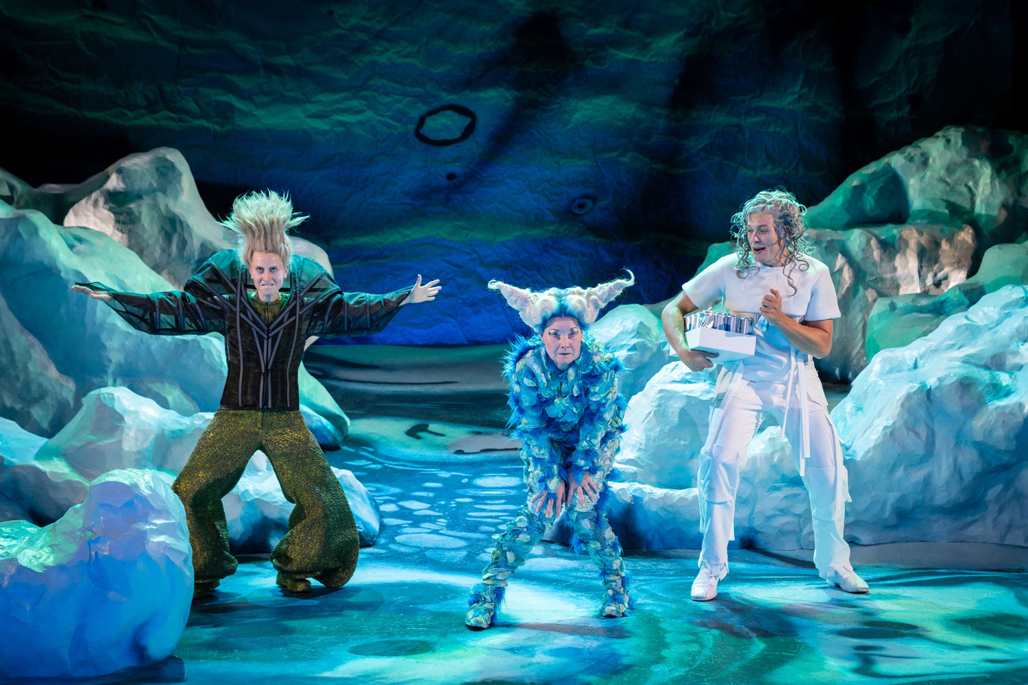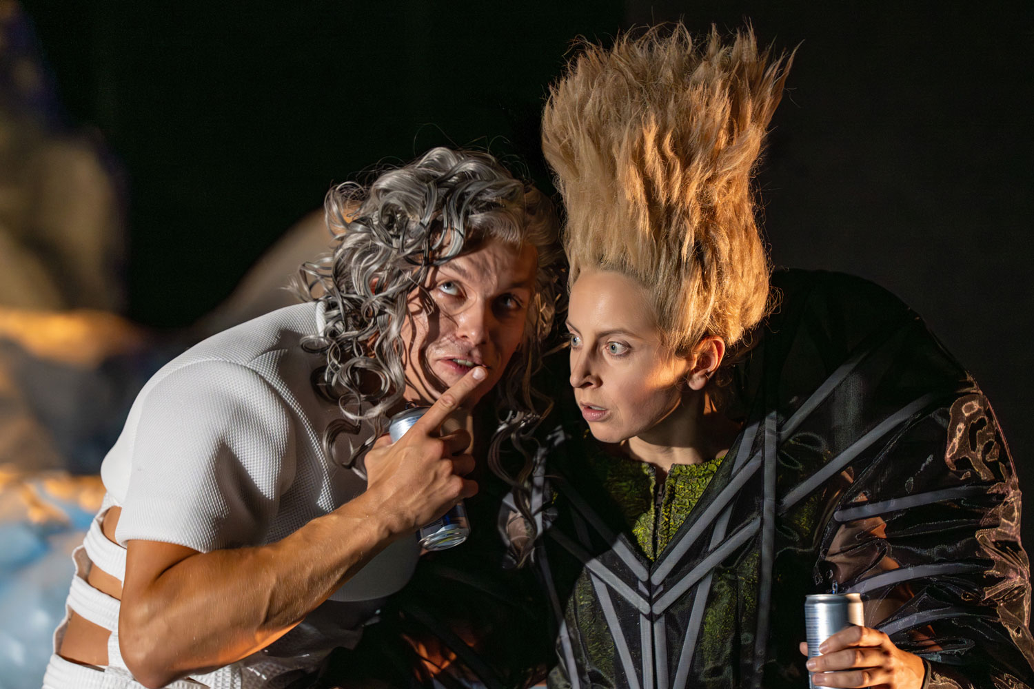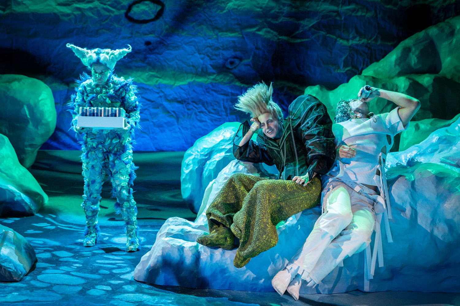 Prospero: Andreas Spaniol/ Miranda, his daughter: Tamara Theisen/ Alonso, King of Naples: Matthias Kleinert/ Ferdinand, his son: Darios Vaysi/ Antonio, Prospero’s brother: Konstantin Gries/ Sebastiano, Alonso’s brother & Trinculo: Esther Berkel/ Gonzalo, the King’s advisor & Stephan: Florian Heise/ Caliban: Caroline Nagel / Ariel: Katharina Shakina